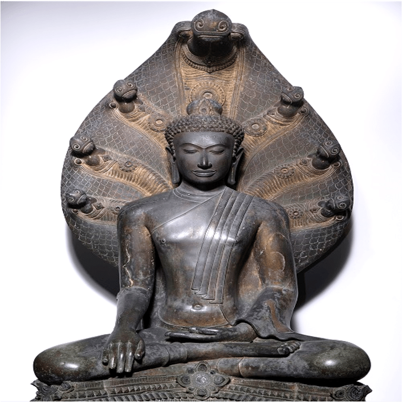 ↑ナークに護られたブッダ(13世紀ころ。東京国立博物館)。