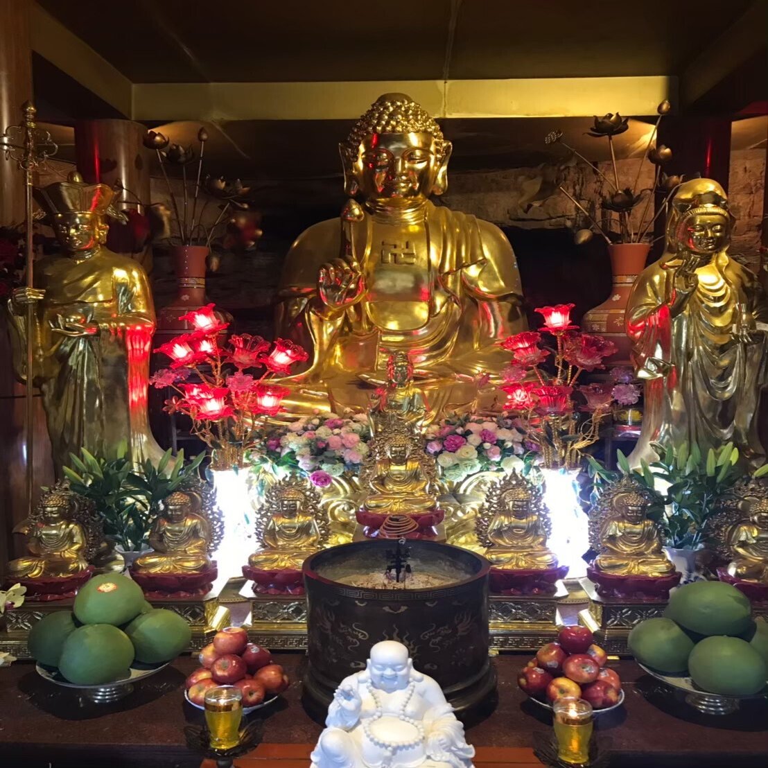 廟には観音像と土地神が並び、道教の護符と仏教の経文が同じ壇上に置かれています。